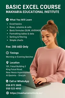Looking to begin your Excel journey in Sharjah? Our Sharjah Microsoft Excel Basics course is perfect for beginners, students, office staff, and job seekers who want to learn Excel from scratch. This course helps you gain essential skills to create, m