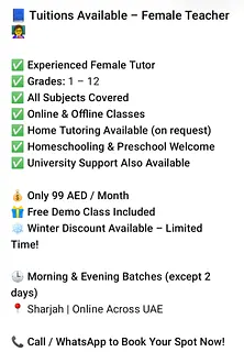 Tuition for all grades/curriculum/female teacher mowelih Sharjah only 99 AED monthly.