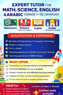 Mathematics (Primary), Physics, Biology, Combined Science, Economics, Mathematics (Calculus/Algebra), Computer Science / Coding, Chemistry, Psychology, Islamic Studies, English Literature, EmSAT Preparation, Business Studies, Sociology, History, History / Geography, Computer Science, Social Studies, Coding (Python/Java), AI & Robotics, Accounting, Other, Geography, ICT, Design Technology (DT)
