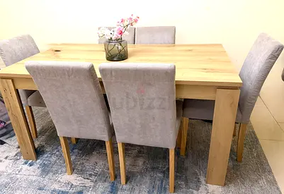 Solid Wood 6-Seater Dining Table with Upholstered Chairs - Oak Finish
